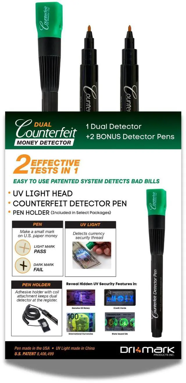 The Dri Mark Flash Test detects fake bills using ink, watermark, and UV light tests.