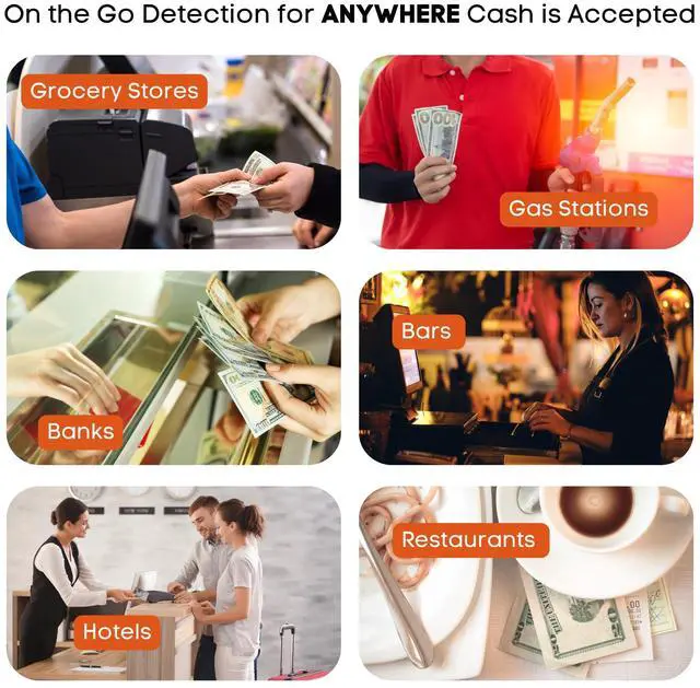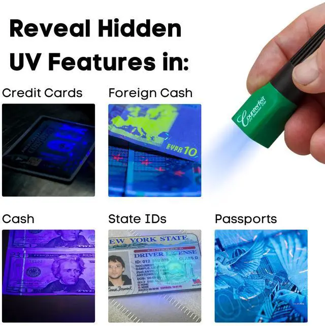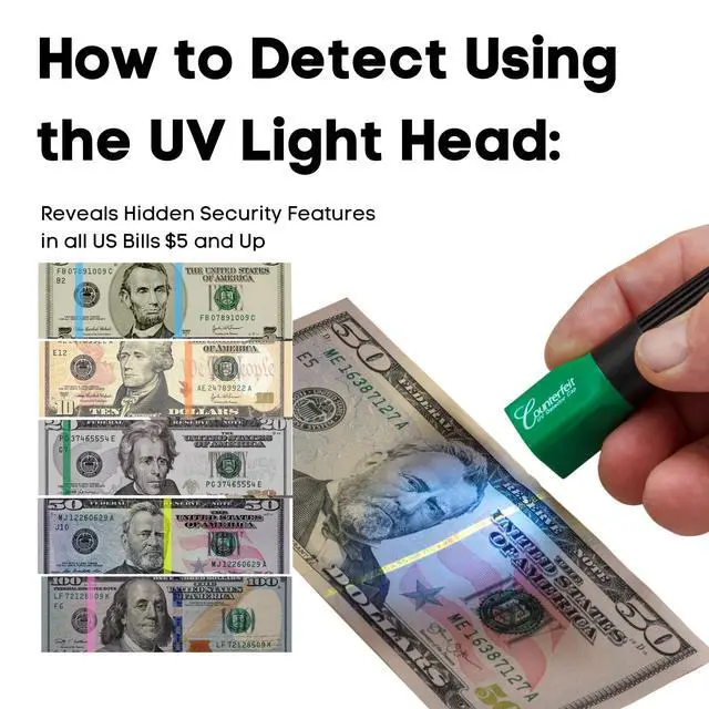 Security strip test: powerful UV light is embedded in the cap and is easy to activate; The LED bulb reveals the hidden security stripe found in all 5 dollar bills and higher.