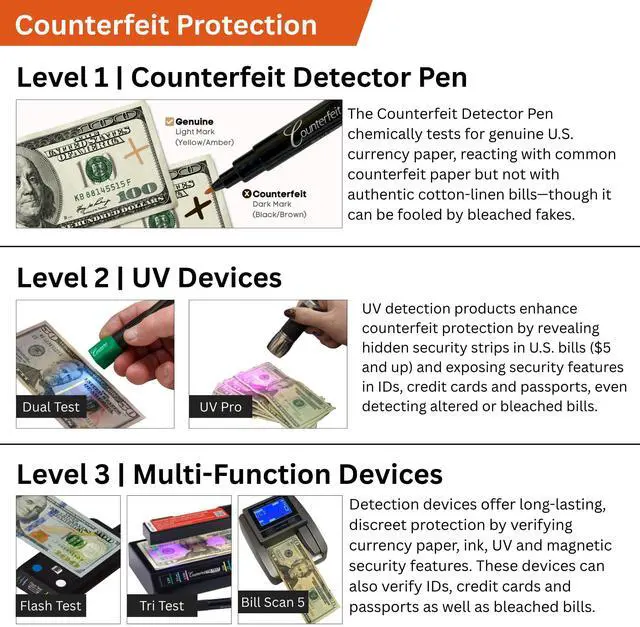 Offers a quick and effective way to screen for counterfeit money. When used correctly—combining both the ink and UV tests—it provides a reliable first line of defense against most fake bills.