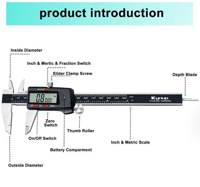 PrecisionKynup outside micrometer measuring tool has a measurement range of 0 - 6''/ 0 - 150 mm; accuracy to ±0.001/0.02mm and resolution to 0.0005"/0.01mm. Perfect and accurate caliper measuring tool for household or DIY measurement. Please choose stainless steel digital caliper measuring tool for more accurate measuring.