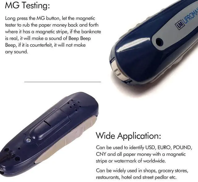 UPROMAX Portable counterfeit detectors are great for banks, bars, gas stations, nightclubs, restaurants, movie theaters and all retail stores. Built with advanced LED technology, long-lasting super bright UV and white LEDs.