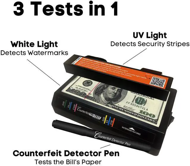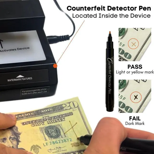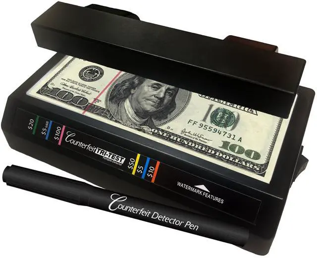 Used to detect counterfeit currency. It combines three counterfeit detection methods in one device: a UV light for security features, a white light for watermark inspection, and a counterfeit detector pen that chemically tests the paper.