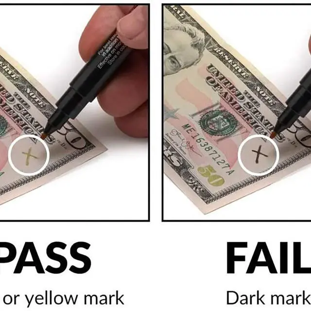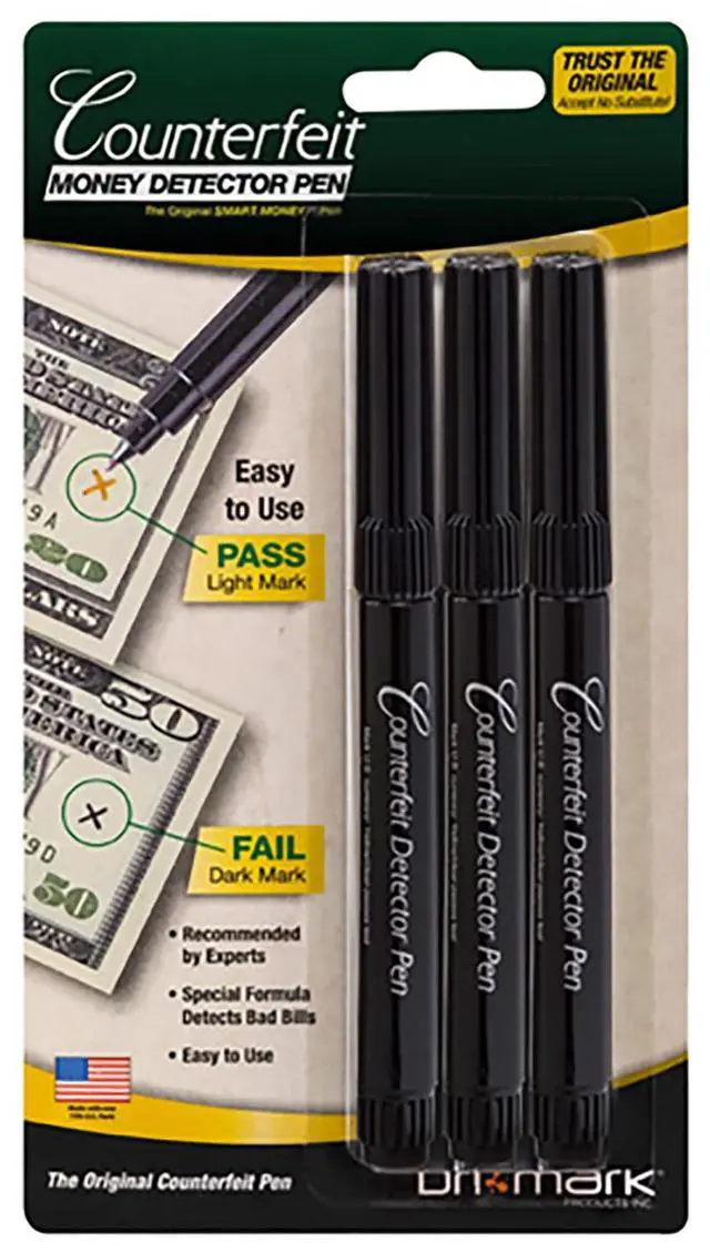 Highly effective and inexpensive tool for detecting bad bills. Simply make a small mark on U.S. currency. Chemically sensitive ink works instantly. An amber mark passes the test, while a dark brown or black mark means the bill is probably counterfeit. Works on all new design U.S. currency bills series 1959 and later. Counterfeit Bill Detector Type: Pen Marking Color: Amber Counterfeit Indication Mark: Black Dark Brown Currency: U.S.