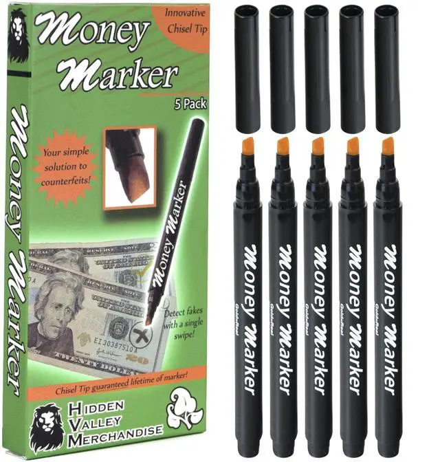Counterfeit Money Detector Pen (5 Counterfeit Pens) - Money Marker Bill Detector Pen with Upgraded Chisel Tip - Detect Fake Bills, Universal False Currency Checker Pack