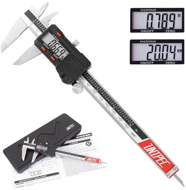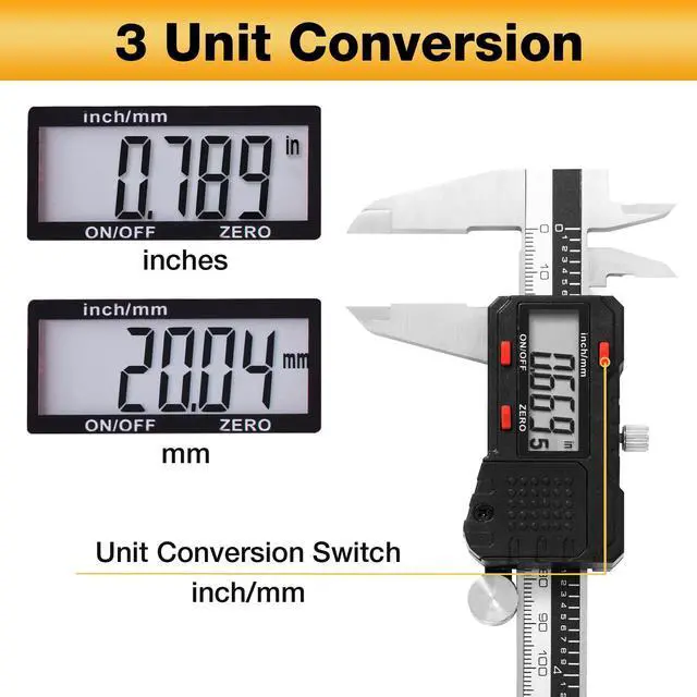 UNIT CONVERSION & LARGER LCD SCREENThese Digital Calipers have a one-key button to quickly switch from inches (inch), millimeters (mm). The 6" digital caliper has a large, easy-to-read LCD DISPLAY which is easy to use and read even under strong sunlight. It will automatically turn off after 5 minutes of non-use to save power.