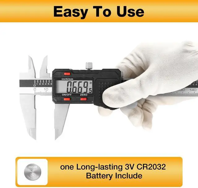 STAINLESS STEEL MATERIALThe vernier caliper is made of high-strength stainless steel and is waterproof and dirt-proof. The service life of this stainless steel digital caliper is longer than that of calipers with plastic or carbon fiber parts. Powered by a long-lasting 3V CR2032 battery, pre-installed to ensure extended use and convenience.