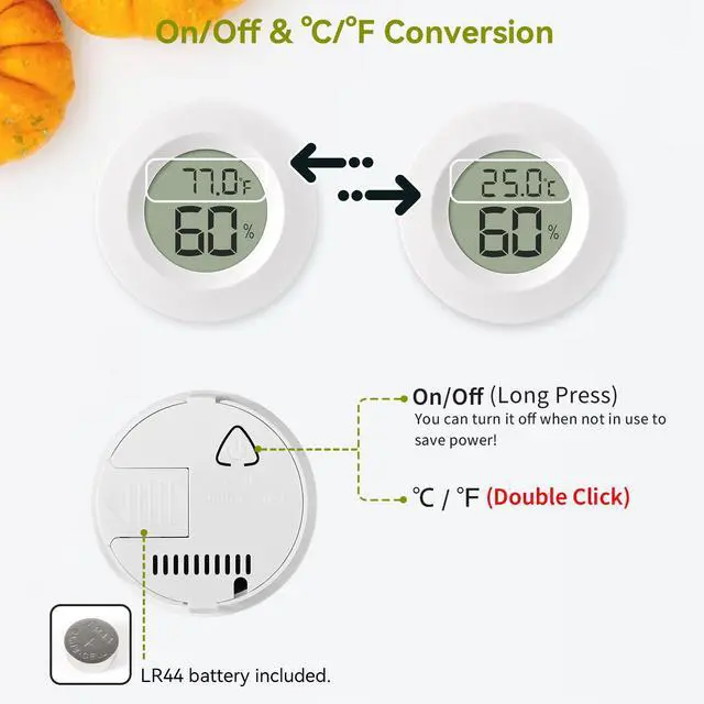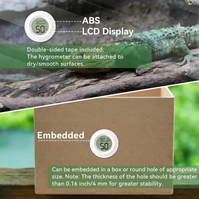 7. Package contents: Hygrometer x2, LR44 battery x2 (extra spare), Double-sided tape x6.