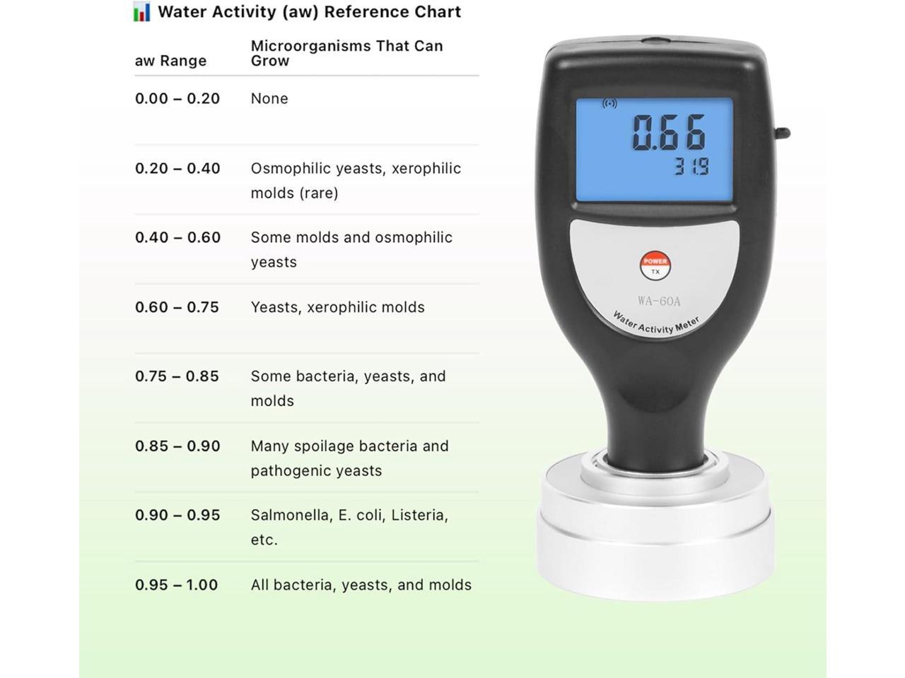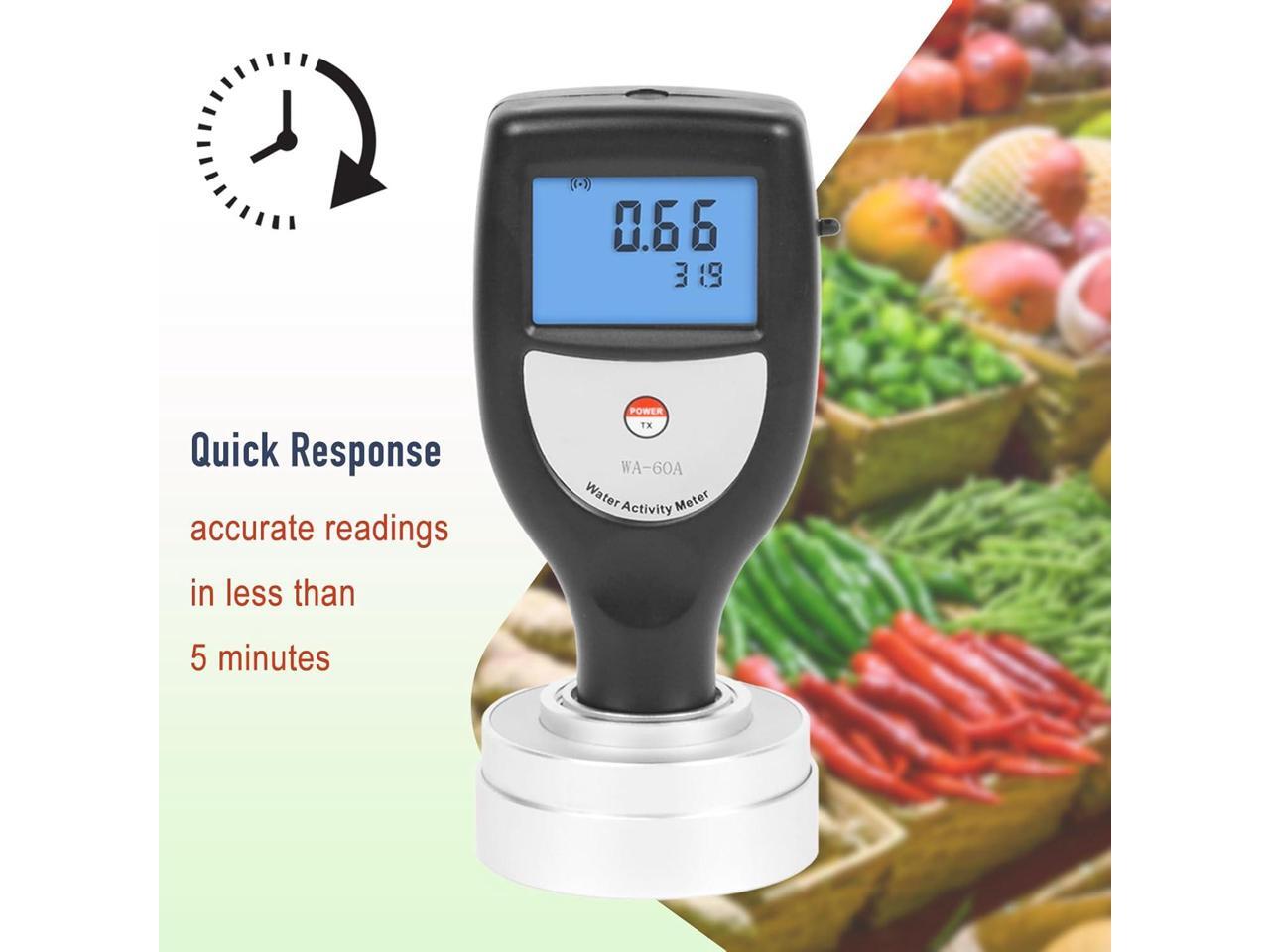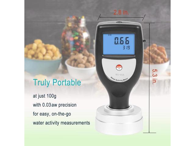 - This is a real portable water activity meter, with a weight of only 100 grams, lighter than a mobile phone, and a precision of 0.02 aw, easy to measure water activity anytime and anywhere. Easy reading, water activity and temperature of the samples displayed together. Use USB data output to connect with PC.
