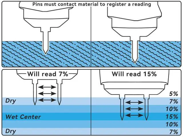 Pins sense and measure along their full length, so that Pins penetrating a dry material through a wet outer surface can read moisture content.