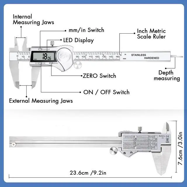 Unit Conversion: Easy to read in inches and mm by pressing the blue button on the top.