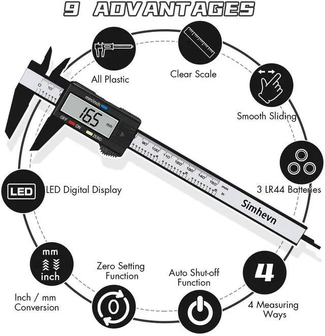 • [4 measuring methods and safety]: Digital calipers can be used to measure inner and outer diameters, depths and steps. The pins of the caliper are made of plastic, so there is no short circuit when measuring the battery or inside. Contact with the positive and negative poles. The safety is higher than that of metal calipers.