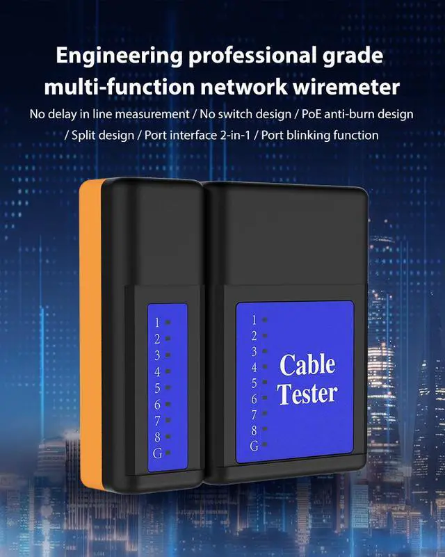 Compatible with RJ45, RJ11, and RJ12, as well as CAT5 and CAT6 Ethernet cables. Perfect for testing PoE lines, patch cords, network panels, routers, switches, and telephone wiring.