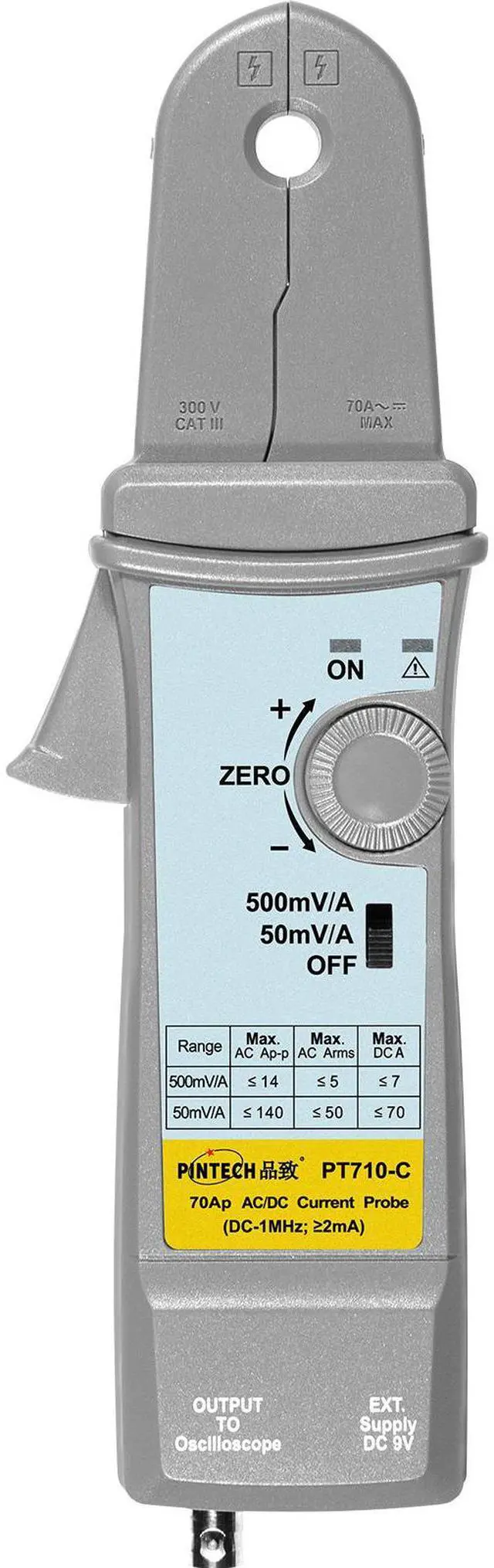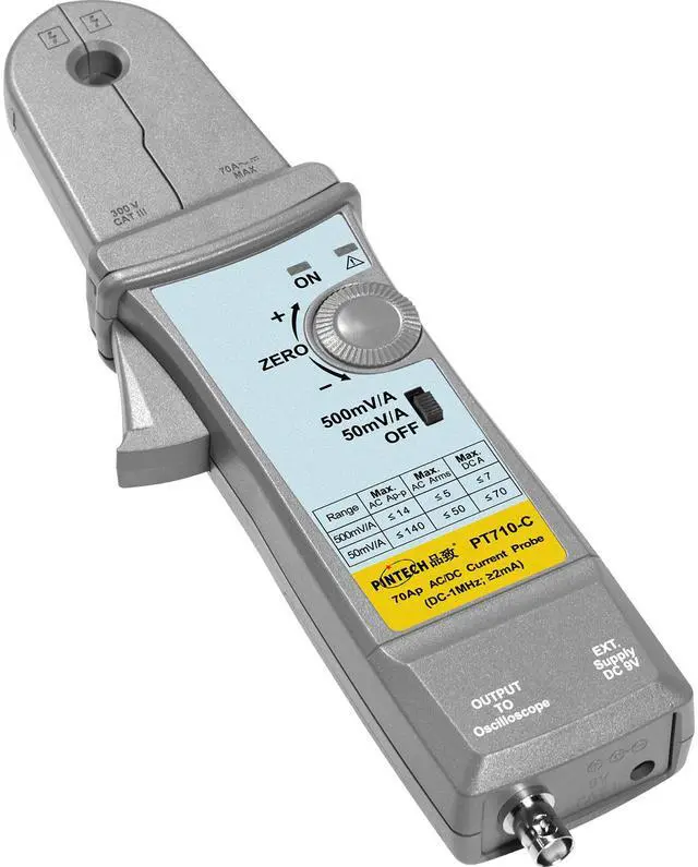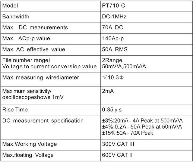 Measurement Accuracy: ±3%: 20mA~14Apeak at 500mV/A; ±4%: 0.2A~50Apeak at 50mV/A; ±15%: 50A~70Apeak at 50mV/AA