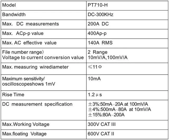 Measurement Accuracy: ±3%: 50mA~20Apeak at 100mV/A; ±4%: 500mA~80Apeak at 10mV/A; ±15%: 80A~200Apeak at 10mV/A