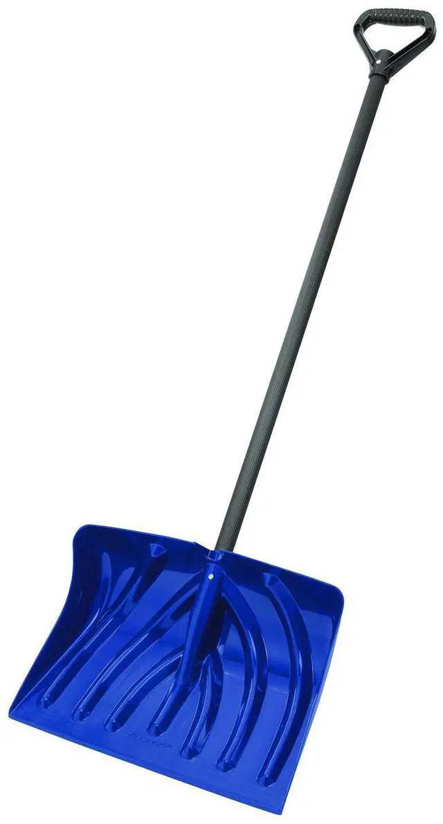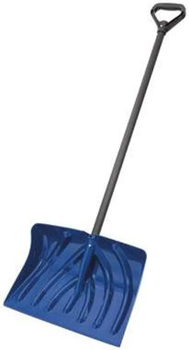Snow shovel/pusher combo. Poly blade measures 18 In. x 12 In. Handle is 1-1/8 In. diameter with steel tube and ribbed grip. Overall length: 51 In. Color: Blue.