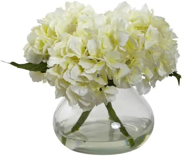 Capturing a blooming hydrangea in all of its glory, this wonderful silk arrangement will add a touch of sunshine to any area. Standing a compact 8.5 in. high, it's not too big, nor too small, but just right for your decorating needs. Besides the soft, full blooms, this piece comes with an attractive vase compete with liquid illusion faux water - it'll stay fresh looking for years.