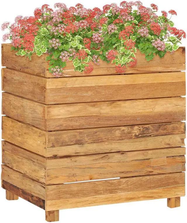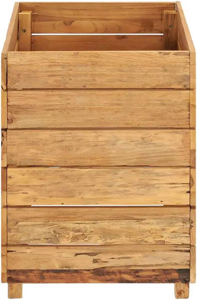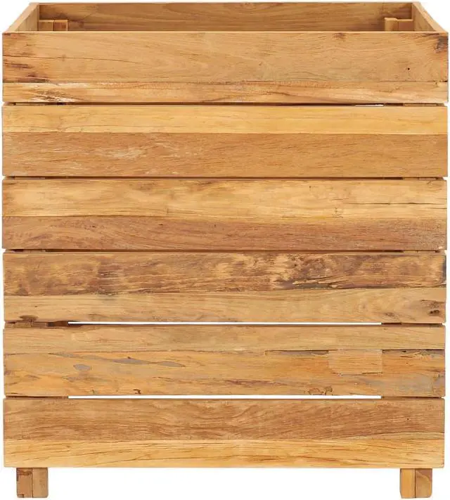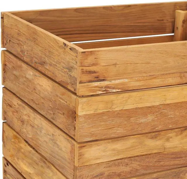 Made of recycled teak, this planter is very sturdy and durable. The beautiful wood grains make every piece of furniture unique and slightly different from the next. Four wooden legs at the bottom enhance extra stability. The bottom of the planter is equipped with a steel rack to put flower pots on. Additionally, the item is easy to assemble.