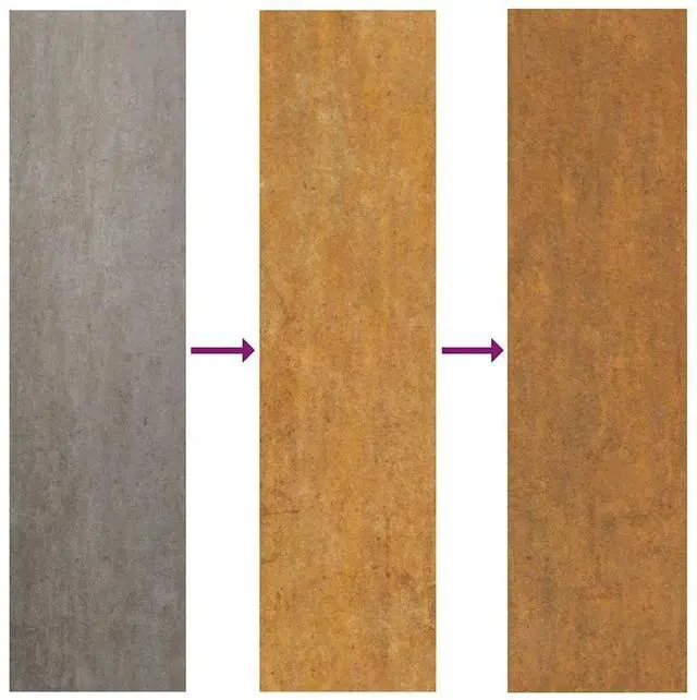 This product is not weathered yet and has a normal metal color when you receive it, but a natural patina will develop over time. You could speed up the aging process by spraying it with soap water and salt water. To keep your clothes stain-free, avoid contact with the developing surface layer.