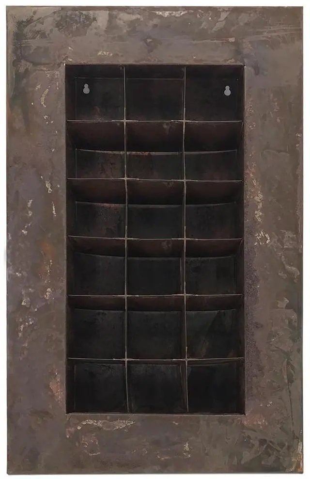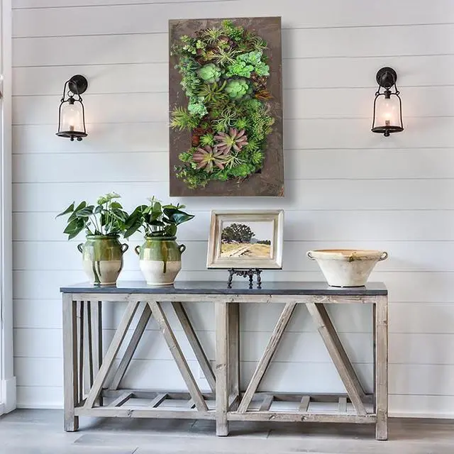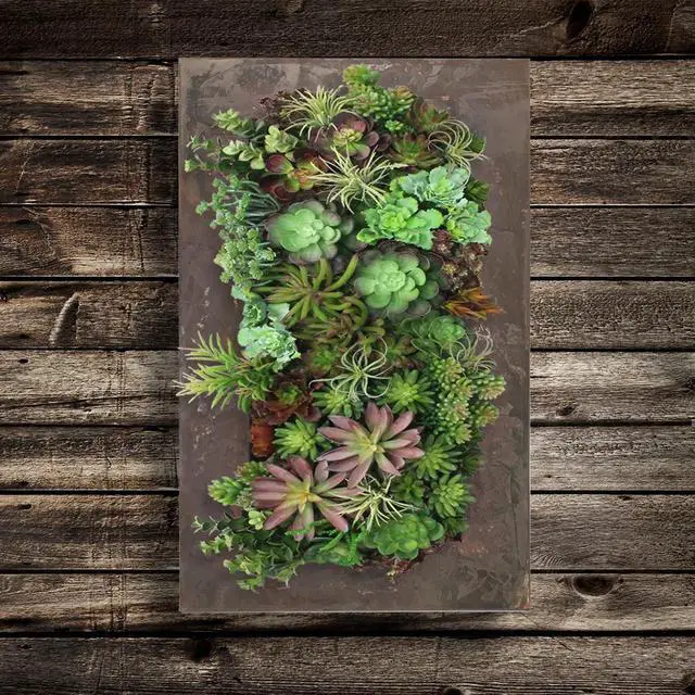 The Modern Home Living Wall Succulent Planter will create a beautiful conversation piece anywhere in your home or office, indoors or outdoors. Constructed of galvanized steel with an aged zinc, black, or rust patina, each wall planter offers an array of slots for planting individual succulents or other small plants. Each cubed planted slot measures about 3.5 in x 3.5 in x 3.5 in. The pockets are designed at an angle so the soil is held in place without falling out. Succulents only require light misting 1-2x per month, so maintenance is simple.