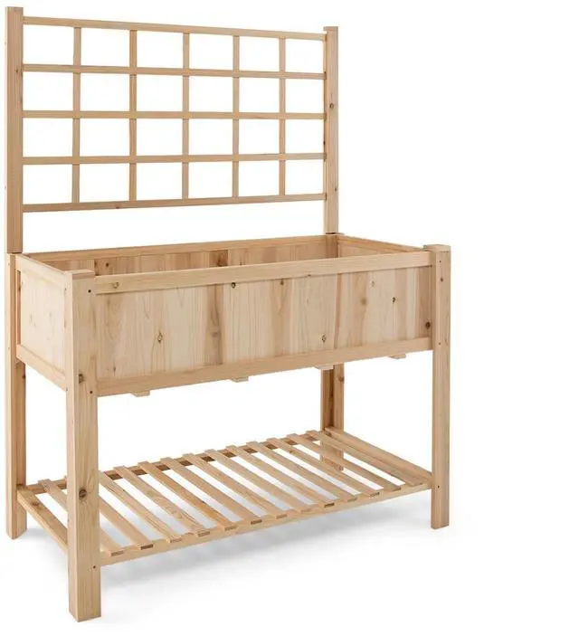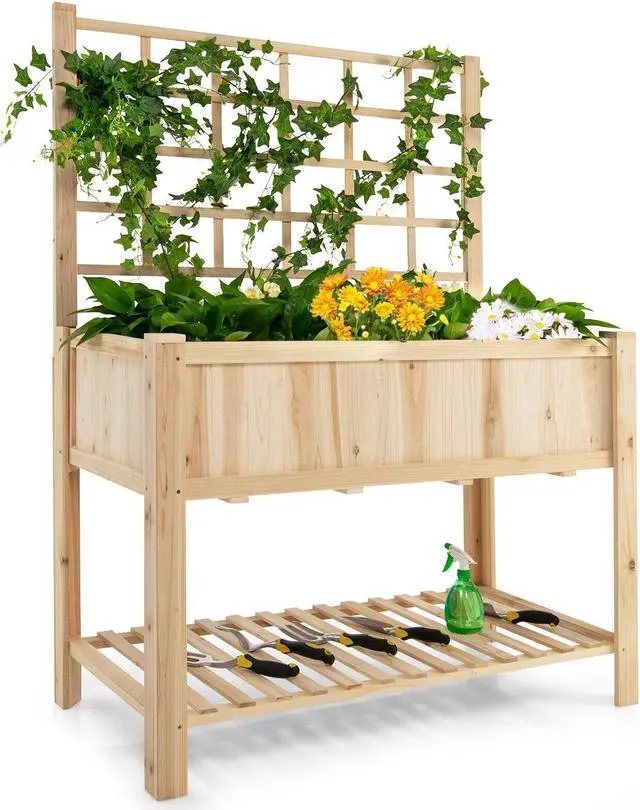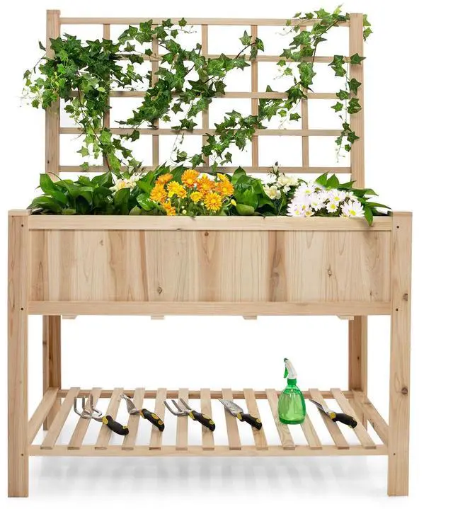 Ample Climbing and Planting and Storing Space: The raised garden bed is designed with a large and deep plant box to cultivate fruits, vegetables, herbs, and flowers, a rectangular grid for planting climbing plants, and a bottom shelf to store shovels, scissors, flowerpots, watering pots, and more. Besides, there also exists a top shelf for storing tools and placing potted plants.