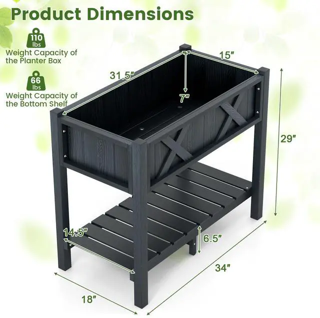 Sturdy and Stable Structure: With its reinforced bottom crossbars and side X-shaped bars, this elevated planter box stand provides a robust and stable structure, ensuring a large load capacity of 110 lbs (the planter box). Moreover, thanks to its additional supporting leg, the bottom storage shelf can load up to 66 lbs.