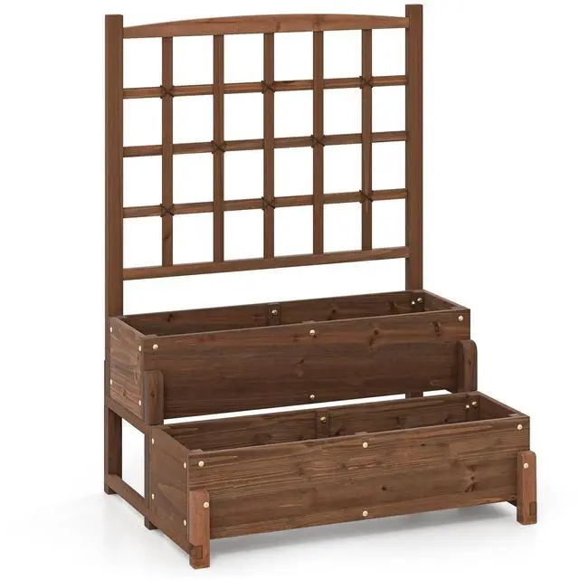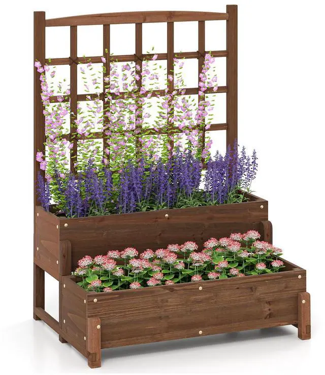 - A space-saving combo of climbing trellis and 2-teir planter boxes