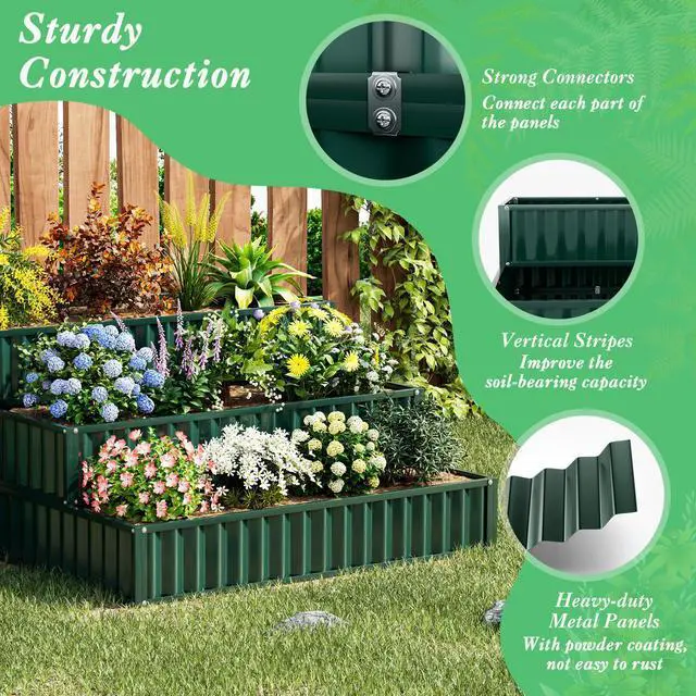 Sturdy Construction: The raised garden bed is constructed of heavy-duty metal panels with protective coating to resist rust and fading. And it adopts vertical stripes that improve the soil-bearing capacity, providing stability and structural integrity for your plants.
