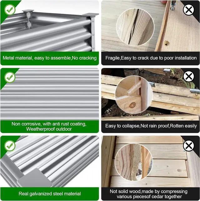 Unique design: raised garden beds outdoor for vegetables, it is our custom-designed style The upper part of the garden bed is galvanized sheet, the middle bottom plate is a stainless steel shelf, and the lower 4 legs are aluminum alloy legs, which are more durable than wooden and anti-rust performance keeps it in the best condition for a long time. The 4 corners above and below the raised garden bed are protected with pads, which not only effectively prevent sharp corners from poking people, but also prevent the floor from being scratched.. The garden box is exquisite and stylish, it brings great convenience to our planting life.