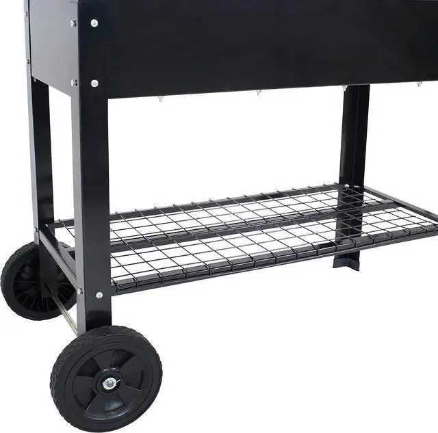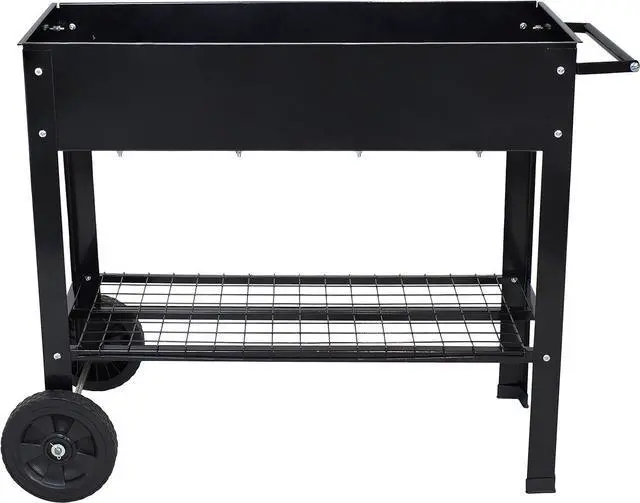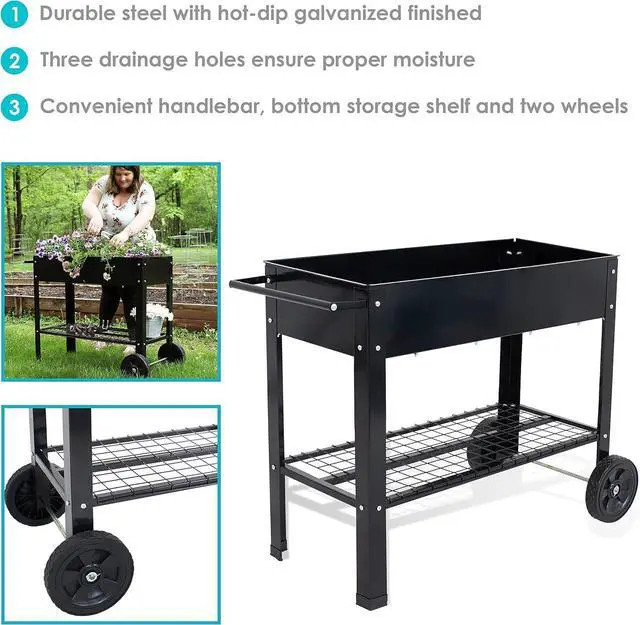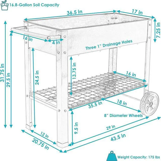 DURABLE STEEL CONSTRUCTION: This elevated planter cart is made from durable 1.5 -millimeter thick steel for long-lasting strength and resistance to outdoor elements. The planter area has a 110-lb weight capacity and can hold approximately 2.25 cubic feet of soil. The bottom shelf has 65-lb weight capacity, and the overall weight capacity of the cart is 175 lbs.