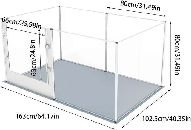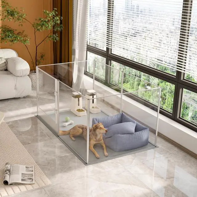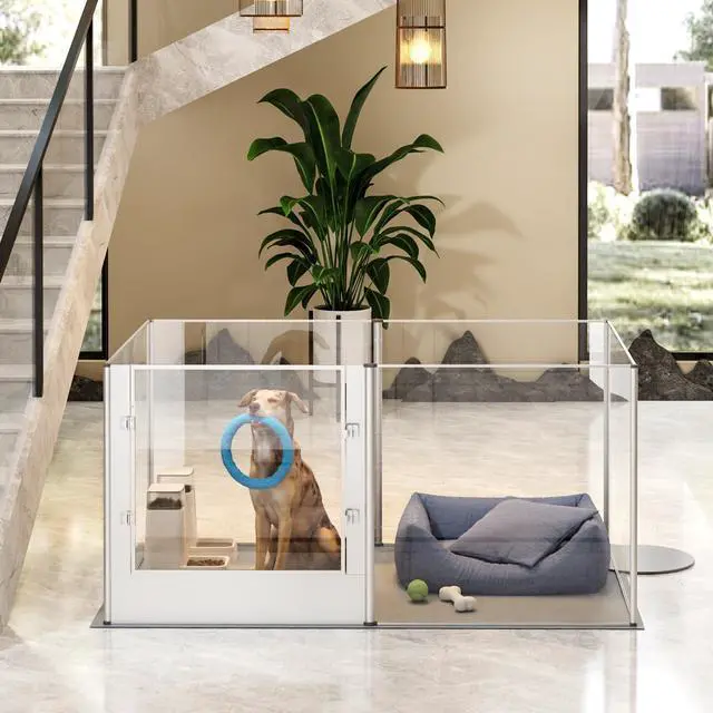 Clear Acrylic Fence DesignCrystal-clear acrylic dog fence playpen enables you can interact with your pets closely, 360° high transparency and wide vision, itll relieve your pets anxiety, they also make sure you are by their side, equipped with a door for dog mom/ pets to come and go easily, so this is a unique gift for your loved friends, get this fence in the room, instantly improve the overall interiors look