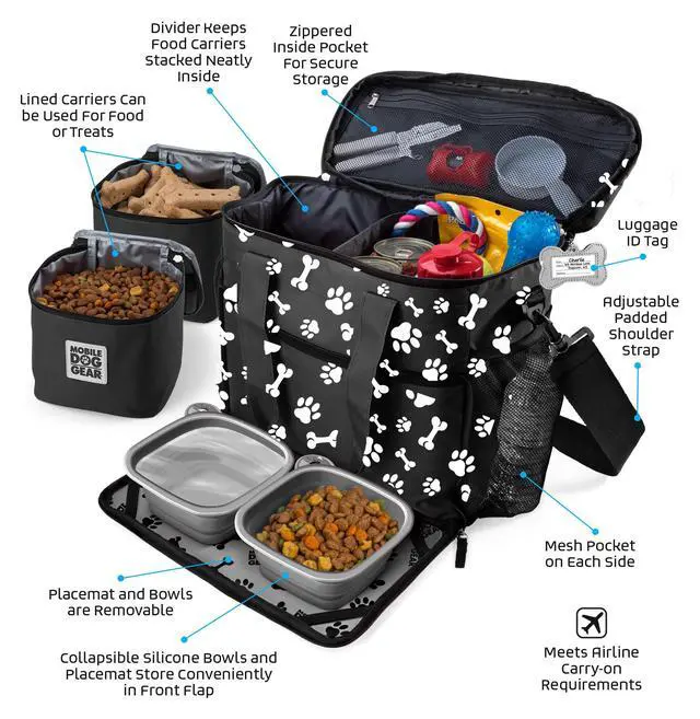 | Included Components | Dog Bag, 2 Lined Food Carriers, 2 Collapsible Dog Bowls |