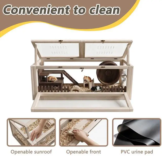 Quality material: the guinea pig house frame is made of quality , and the material of the windows are transparent acrylic panels, so that you can always have a clear view to observe the activities of your precious hamsters. It also comes with a clear PVC sheet to place on the bottom of the cage, it avoids moisture and makes cleaning so much easier. Ensure a safe and tidy living environment for pets.