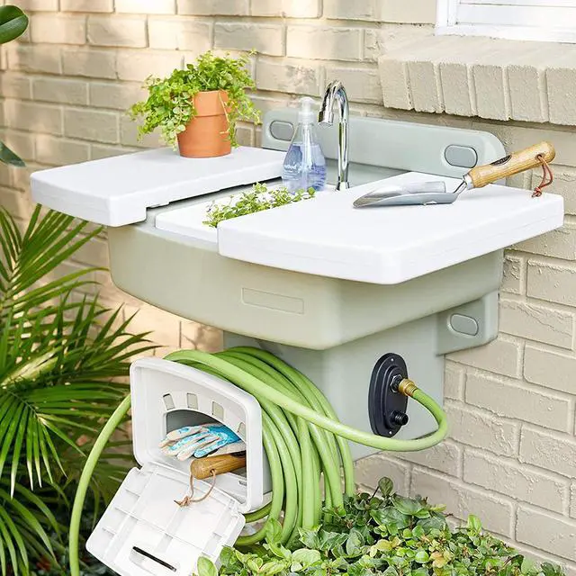 From Modern Home comes a perfect way to have a sink in your garden. Our Outdoor Wall Mounted Garden Sink is a folding, wall mountable sink that will allow you to have a running faucet outside. Great for projects in the garden and cleaning up outside without needing to bring the dirt inside. Features a sliding tray cover which opens to create workspace outdoors while protecting the sink from the elements when closed. Also includes a hose reel at the bottom (hose not included) and a utility storage compartment to neatly store small gardening tools, gloves or other items.