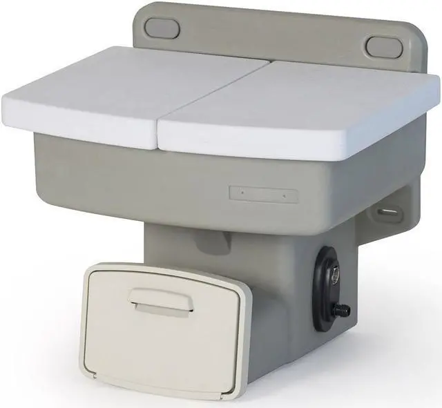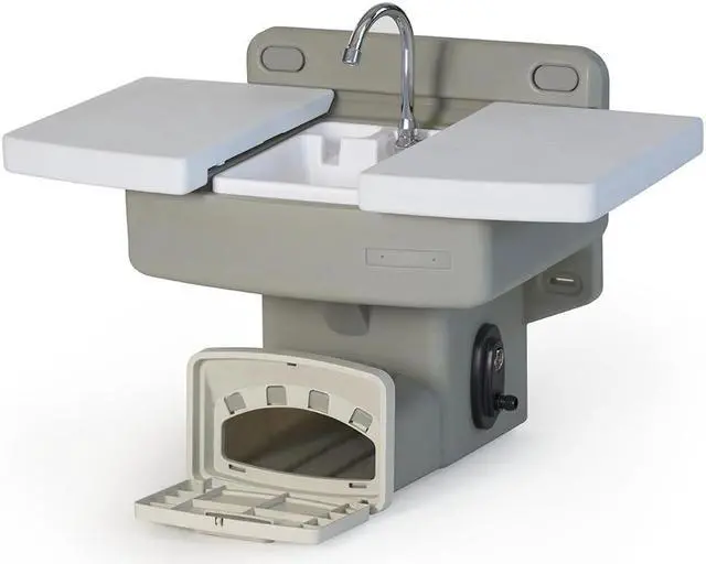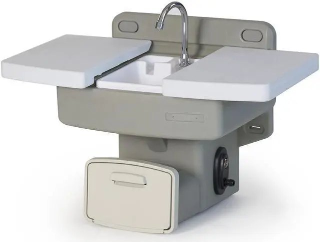 Measures 21" x 17.5" x 22" tall. Mounting hardware not included. Made of Polypropylene/polyethylene. No plumbing required. Sink water is supplied from your garden hose.
