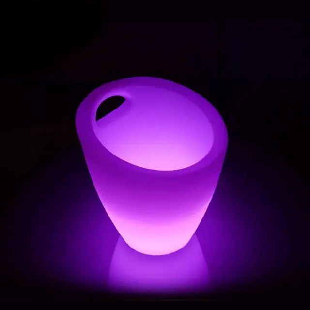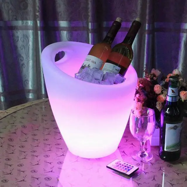 No batteries to change. Rechargeable batteries pre-installed. Measures 11.4 inches x 11.8 inches x 13 inches. Each bucket comes with a remote control allowing you to set the bucket to any color, modify the brightness, and also set the light changing show to a fading or strobe effect. Includes glowing ice bucket, IR remote control (30' range), and power adapter.