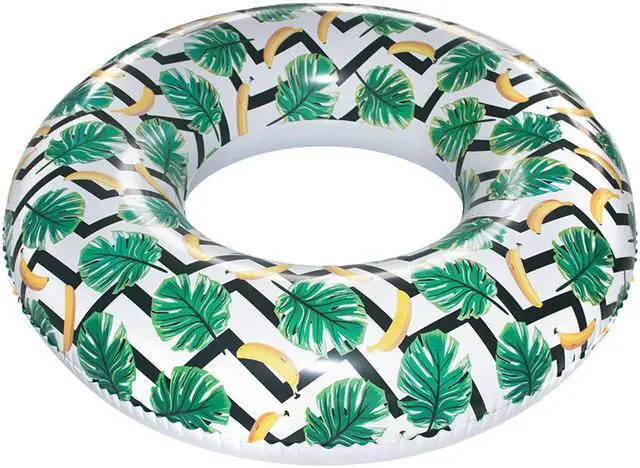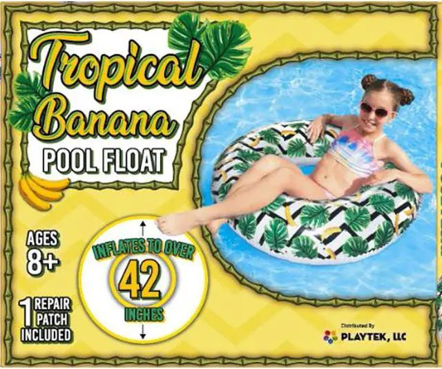 Fun tropical banana print. Perfect for lounging, relaxing pool side, or decoration. Recommended age is 8+. Do not leave children unattended, and it is not a life saving device. Use only under adult supervision. Inflates to over 42 inches and is made of thick, durable PVC material.
