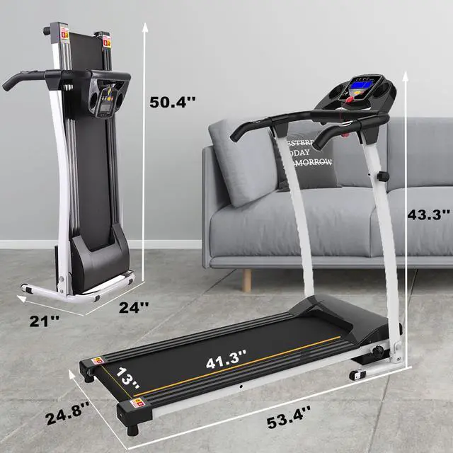 Specification: Running Surface: 41.3" x 13" (L x W) Unfolded Size: 53.4" x 24.8" x 43.3" (L x W x H) Folded Size: 24" x 21" x 50.4" (L x W x H) Motor Power: 1.5HP Rated Voltage: 110V / 50Hz Speed: 0.5-6.5mph User Capacity: 220LBS