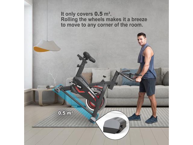 - SMOOTH STATIONARY BIKEConfiguring different resistance levels can bring you a realistic road feel. Different resistance levels can meet your different needs for exercise thus burning more calories. And the built-in push-down emergency brake can protect your safety in dangerous situations.Easy and quick to set up and take down, with an extremely space-saving design .Easily moveable with the front-mounted transport wheels of the spin bike.