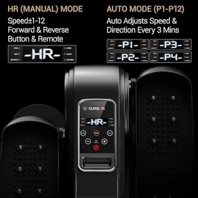 HR & Auto Mode: Exercise anytime, anywhere. In HR (Manual) mode, you can adjust workout time(15-30min), speed(1-12) and direction (forward&reverse) by remote control or button of the elliptical machine. Then switch mode to Auto mode that the speed and direction have been programmed. In auto mode, you can adjust P1-P12 mode by press mode button, the speed of the mini seated elliptical changes every minute, and the direction changes every 3 minutes