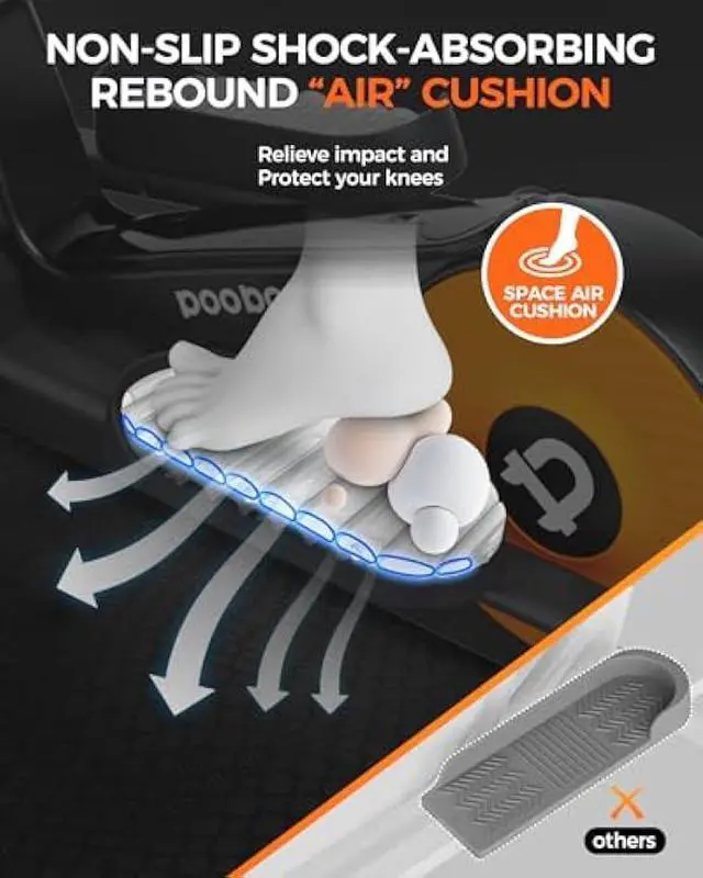 5. The transparent non-slip and rebound pedal cushion offers a smoother motion feeling like space walk and reduce ankle&knee stress. D-shape handrail structure more like a commercial elliptical that satisfying the needs of all-round workout experience