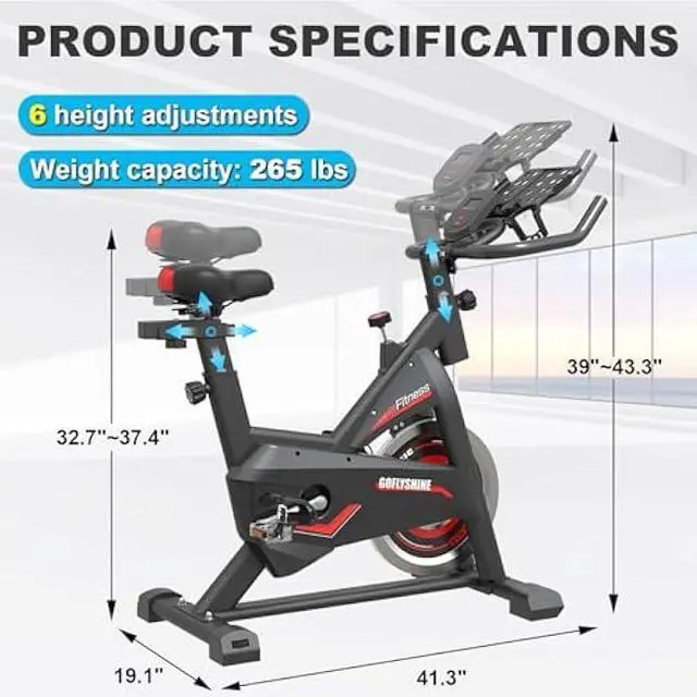 PERSONALIZED EXERCISE BIKEOur indoor cycling bike comes with fully adjustable handlebars and built in arm and elbow rests. At the same time equipped with adjustable height seat. (seat adjustable height 32.7 - 37.4 in, handlebars adjustable height 39- 43.3 in). The seats are ergonomically designed, and can easily moves forward/back and up/down.
