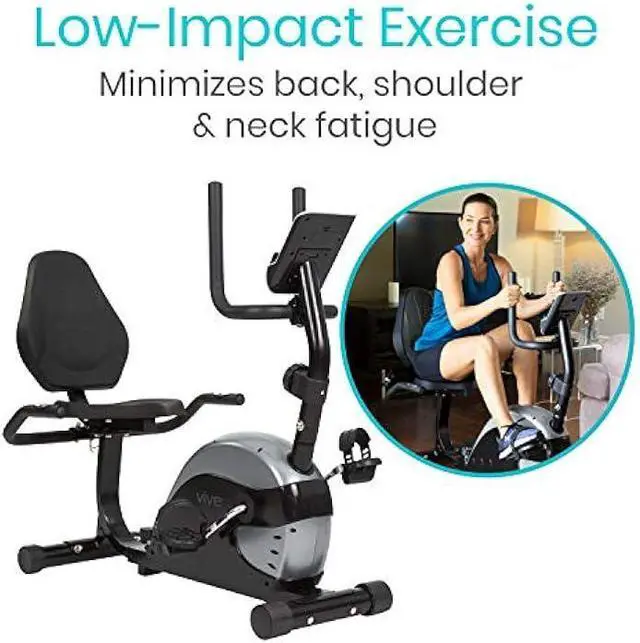 ADJUSTABLE STEP THROUGH DESIGN FROM A TRUSTED BRAND: Easy on both the back and knees, the Vive recumbent bike provides low-impact cardiovascular exercise that also supports the spine to minimize fatigue in the back, shoulders and neck. The step-through bike is easy to mount and dismount without overextending the leg or hip and is also adjustable to comfortably fit those 52 and up.