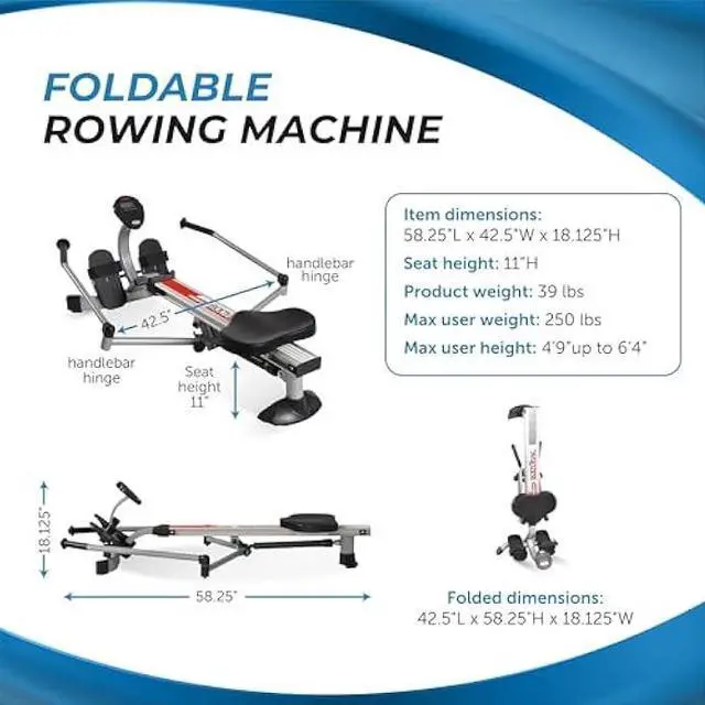 COMFORTABLE AND SPACE SAVING - The row machine is designed with a padded and molded seat for comfort during longer rowing routines and textured footplates with straps to keep your feet secure. When youre done rowing, the exercise rower folds to save you space.