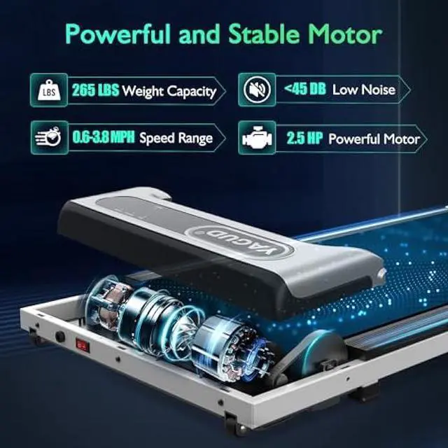 2.5HP Powerful Motor: The treadmill is equipped with a powerful 2.5HP motor and offers a large weight capacity of up to 265 lbs. And it is quiet while using. Using noise below 45 DB, so you can exercise while not disturbing others.