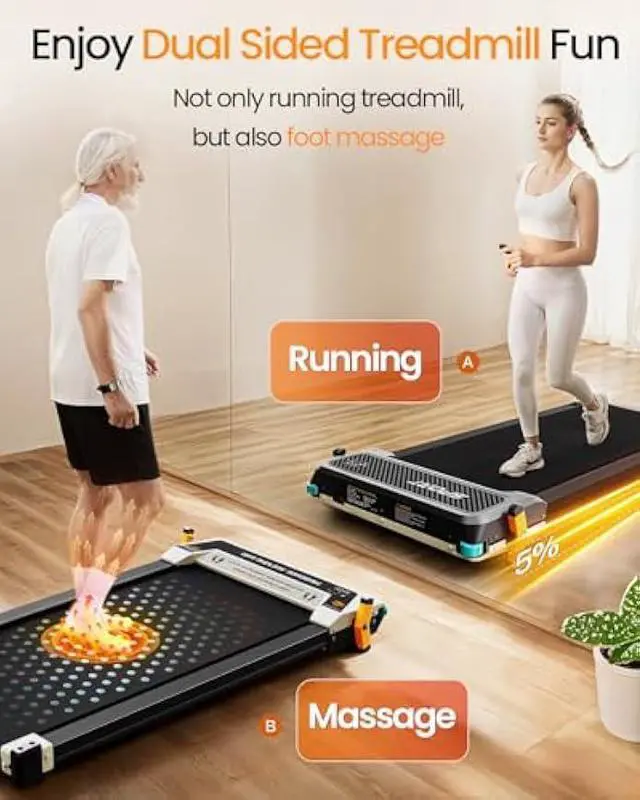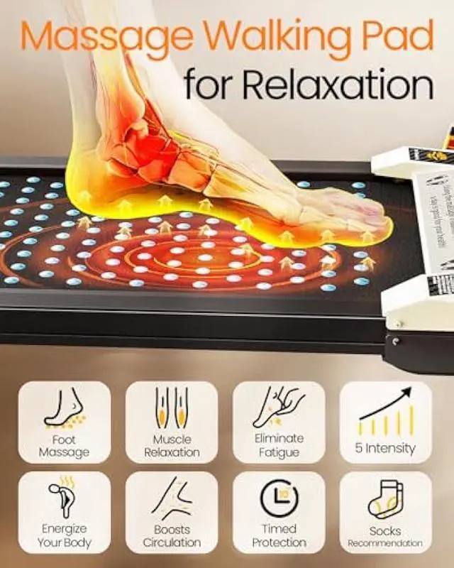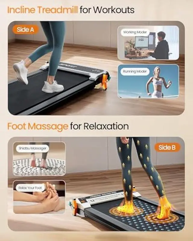 Dual-Function Treadmill: Walking pad treadmill can be used on both sides. Side-A walking pad with incline. Side-B treadmill with foot massage. After you finish your running workout, our treadmill effectively relieves fatigue and muscle tension, alleviates foot soreness, and provides a soothing massage effect for relaxation