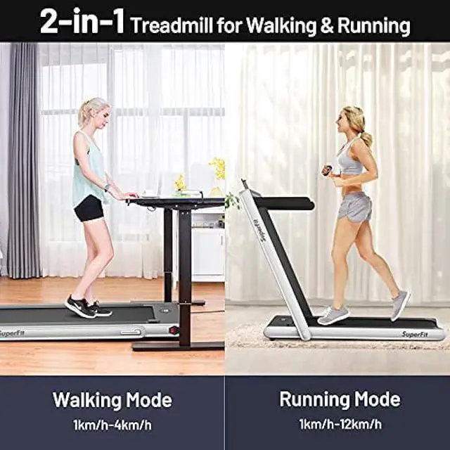 Home Gym 2 in 1 DesignThe 2-in-1 folding treadmill offers adjustable speeds from 1 km/h to 12 km/h for running with risers up and 1-4 km/h for walking with risers down. Besides, you don't need to worry about disturbing others, because the powerful motor with quiet design makes it very suitable for home and office use. Meanwhile, speed unit could be switched between mile and km in APP
