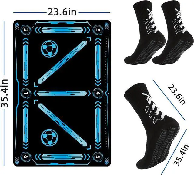 Great Value SetThis Soccer training set includes a 35.4 * 23.6 in, thickened soccer action training mat, Comes with professional black premium football training grip socks to prevent slipping to improve stability and concentration.
