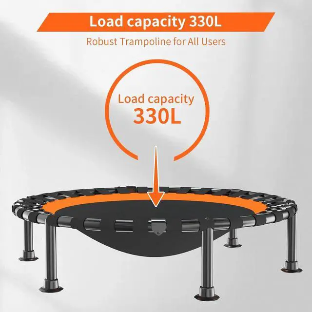 330 LBS Weight Capacity32 high-strength bungee bands, 3.5 mm thickened steel, and wear-resistant PP mat make the 2024 upgraded fitness trampoline can bear up to 330 LBS.