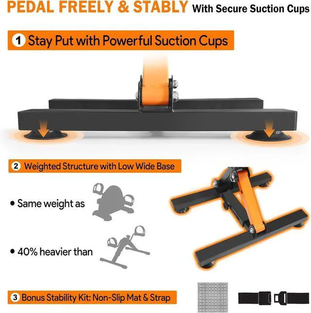 SECURE: Our upgraded under desk pedaler delivers smooth, silent pedaling for uninterrupted focus. Anti-slip mat, a strap, combined with our new suction cup base, ensure rock-solid stability. Plus, a simple safety bolt pin makes installation a breeze. No more distractions, no more sliding, just pure exercise enjoyment.