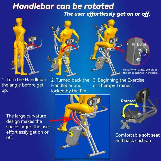 Easy to Use: The Handlebar can be rotated, and the large curvature design of mainframe makes the space larger, so the user effortlessly get on or off, especially for home seniors workout. The Elastic pin is easy to use